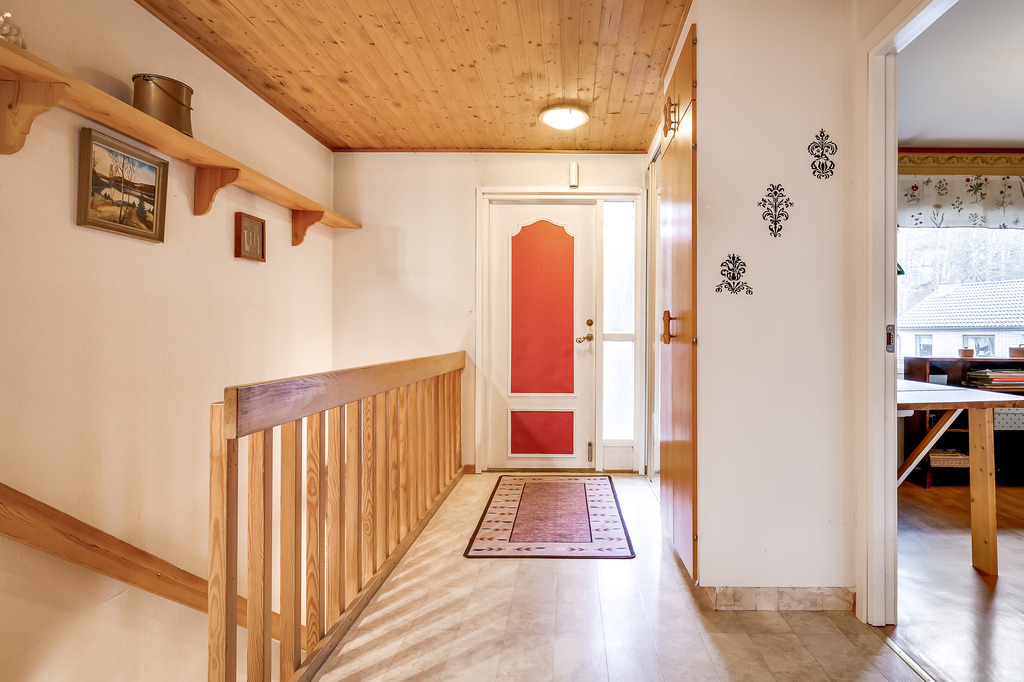 Den rymliga hallen går i vinkel och öppnar upp mot köket på ett inbjudande sätt. Innanför ytterdörren finns plats för avhängning bakom spegelskjutdörrar och även i en dubbelgarderob. En trappa leder från hallen ned till källarplanet.