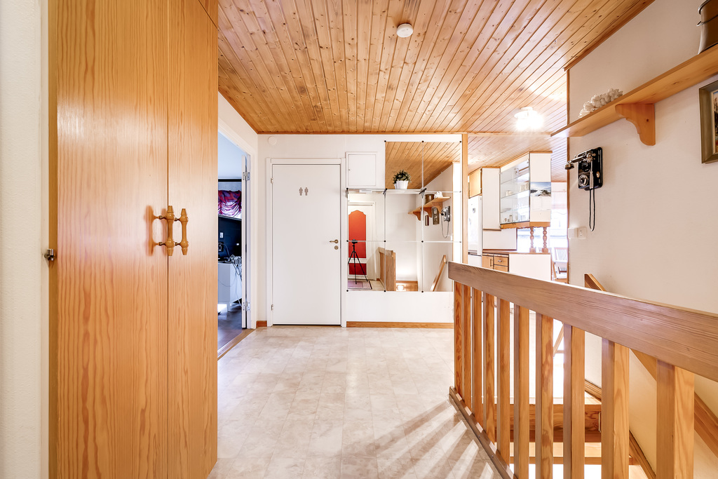 Bostaden är utrustad med två duschrum och en separat tvättstuga, vilket underlättar för den stora familjens behov. Med 3–5 sovrum finns flexibiliteten att skapa allt från barnrum och hemmakontor till gästrum. I källarplanet hittar du ett inrett garage som idag används som hobbyverkstad – en perfekt plats för den händiga, oavsett om det gäller snickeri, mekande eller kreativa projekt.