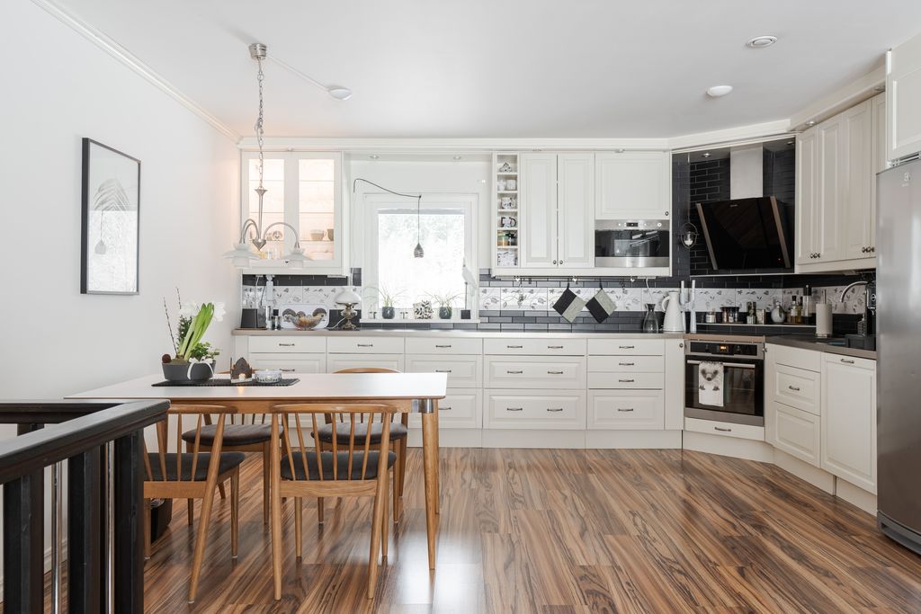 Köket är funktionellt och smakfullt inrett med klassiskt vita spegelluckor, mörkgrå bänkskiva och gott om både arbetsyta och förvaring. Vitvarorna är integrerade och omfattar diskmaskin, induktionshäll med fläktkåpa, kyl och frys i fullhöjd, samt inbyggnadsugn och mikro.